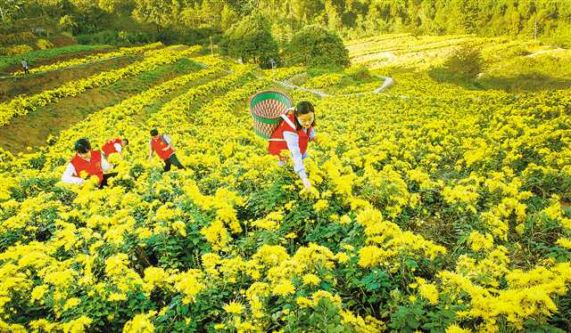 11月3日,在万盛经开区南桐镇王家坝村,青年志愿者为农民采摘金丝皇菊。深秋时节,当地金丝皇菊种植基地的100多亩金丝皇菊进入采收期。